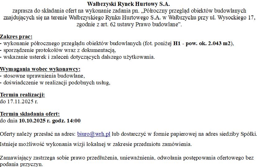 OGŁOSZENIA ZAPYTANIE OFERTOWE Posted 26 września 202529 września 2025 red. na wykonanie okresowego półrocznego przeglądu obiektów budowlanych na terenie Wałbrzyskiego Rynku Hurtowego S.A.