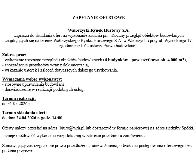 OGŁOSZENIA ZAPYTANIE OFERTOWE Posted 8 kwietnia 2026 red. na wykonanie rocznego przeglądu obiektów budowlanych na terenie Wałbrzyskiego Rynku Hurtowego S.A.